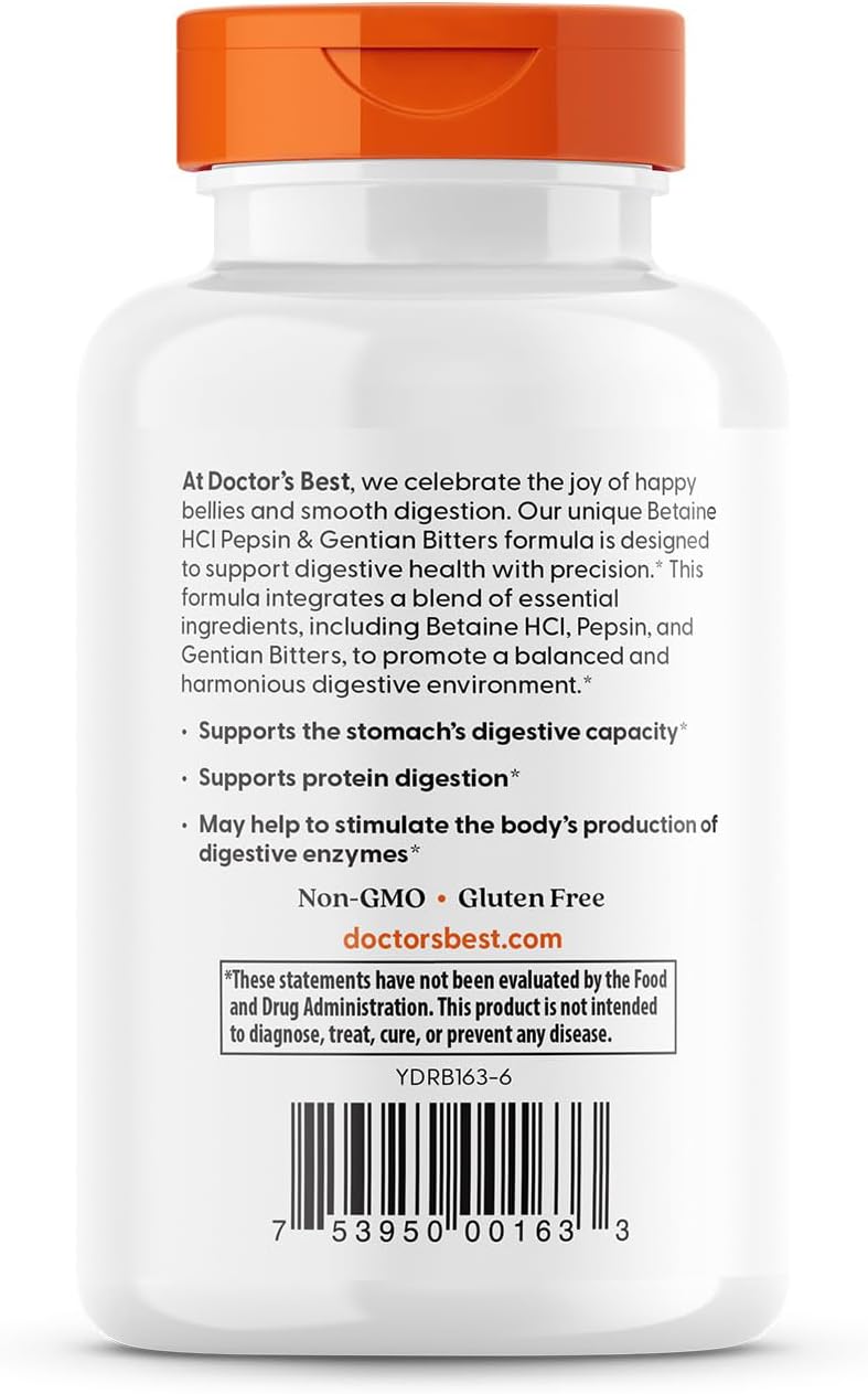 Doctor’s Best Betaine HCI Pepsin & Gentian Bitters, Digestive Enzymes for Protein Breakdown & Absorption, Non-GMO, Gluten Free, 120 Caps, Original Version